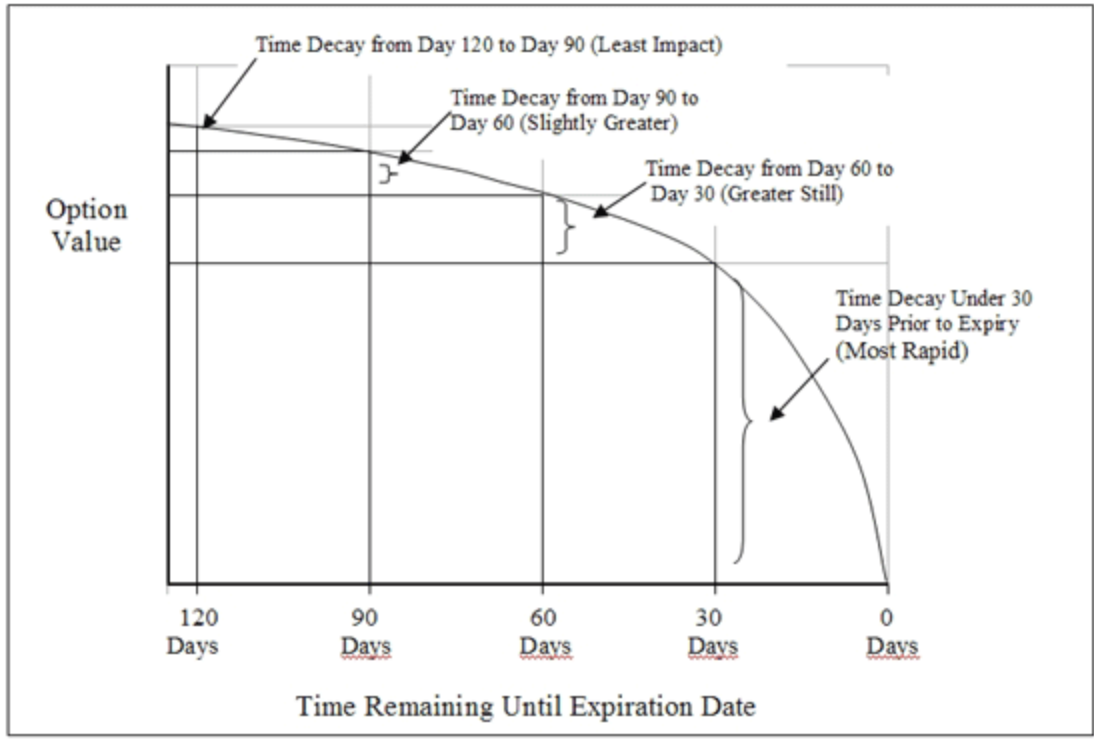 The value of an option decreases as time passes and expiration approaches. This is called *theta decay* or *time decay*.